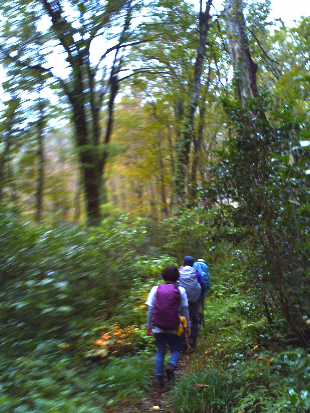 途中いい感じのブナ林でランチタイム!食べ始めたと同時にこの日いちばんの雨に降られた!なんとゆうタイミング!